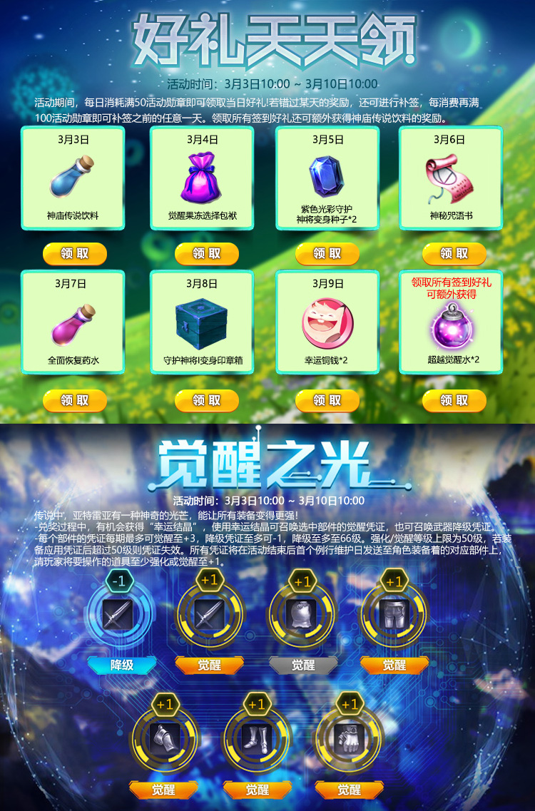 觉醒凭证、强化凭证等奖励,将在活动结束后的例行维护日统一发放,请获奖玩家将要操作的道具装备在身上,并至少强化或觉醒至+1,如未装备视为自动放弃。