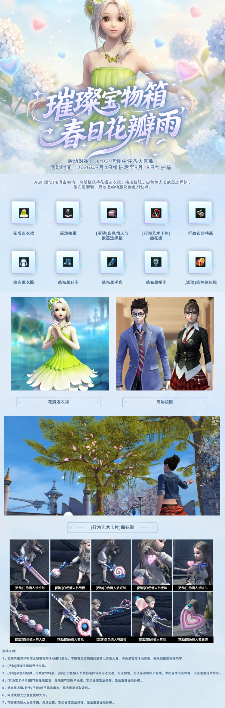 春风轻拂,万物新生,微风商会璀璨宝物箱登场!清新活力的花瓣连衣裙唯美亮相,经典时尚的简洁校服元气满满,更有白色情人节武器选择箱、德布里套装、行政官的特惠及染色剂包袱等缤纷春日好礼,等你来开启!(立刻购买>>)