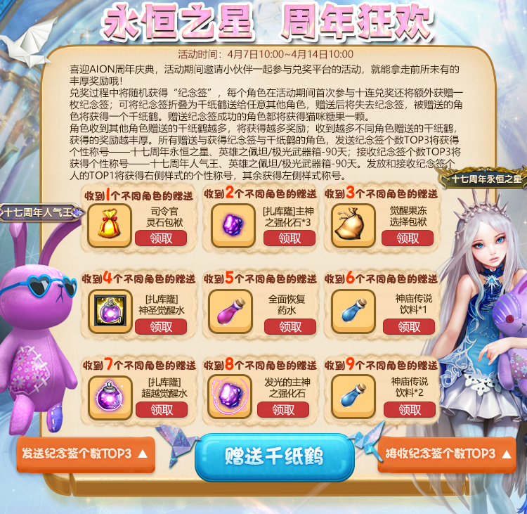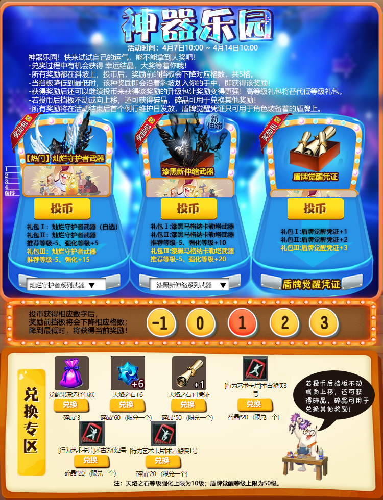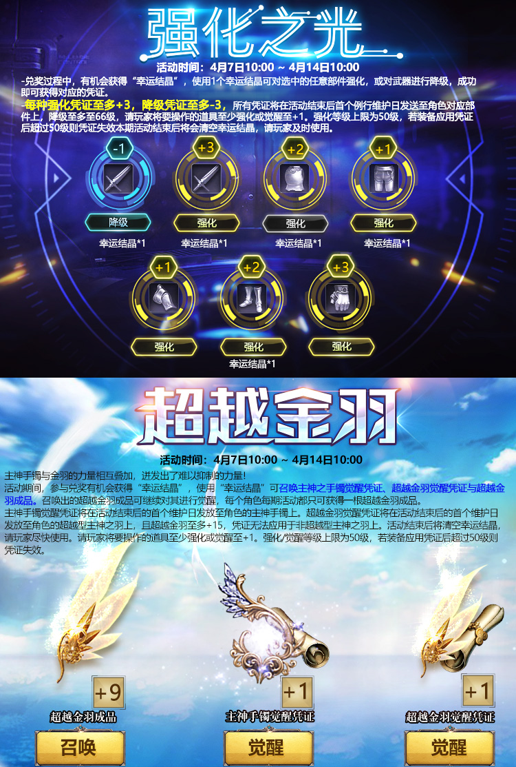 觉醒凭证、强化凭证等奖励,将在活动结束后的例行维护日统一发放,请获奖玩家将要操作的道具装备在身上,并至少强化或觉醒至+1,如未装备视为自动放弃。