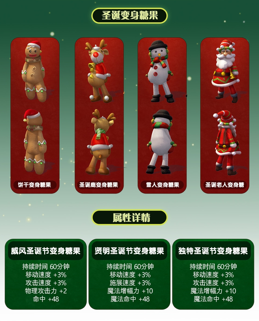 圣诞节变身糖果,让守护者们化身圣诞老人、圣诞鹿及可爱的雪人、饼干,解锁奇妙圣诞夜“专属皮肤”。微风商会限时福利,赶快加入圣诞派对,让甜蜜加倍吧~(立刻购买>>)